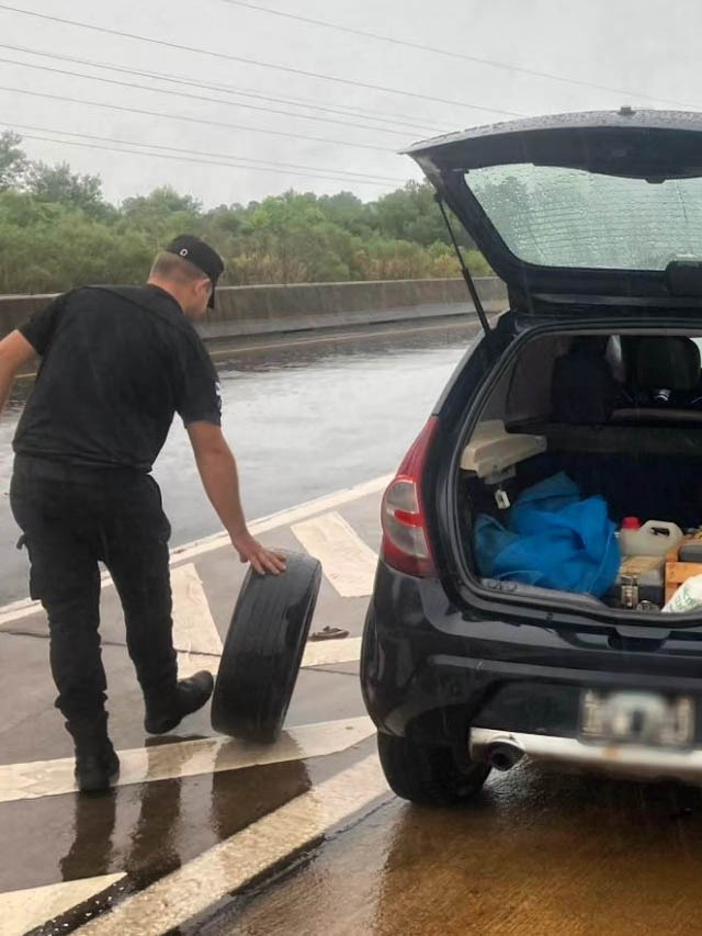 En ese contexto, efectivos de la Comisaría de Santa Ana que realizaban recorridas preventivas detectaron el vehículo detenido y procedieron a asistir al conductor. A pesar de la lluvia, los uniformados colaboraron en el cambio del neumático y brindaron cobertura para resguardar la seguridad en la zona.
